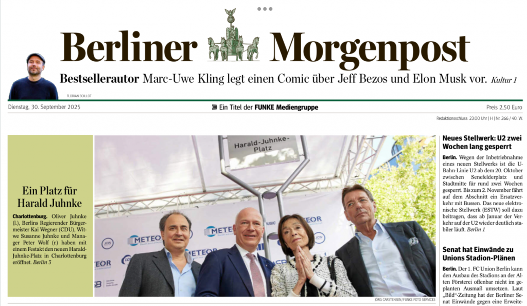 Bundesweite Beachtung in TV, Radio, Online und Print fand am Montag die Feierliche Eröffnung des Harald-Juhnke-Platzes am Kurfürstendamm in Berlin. Neben dem Regierenden Bürgermeister von Berlin, Kai Wegner nahmen auch die Witwe und der Sohn von Harald Juhnke, Susanne und Oliver Juhnke, sowie Prominente aus Politik, Gesellschaft und Kultur wie der ehemalige Regierende Bürgermeister Klaus Wowereit und die Künstler Dieter Hallervorden, Ben Becker, Ludger Pistor, Karsten Speck, Barbara Schöne, Mariella Ahrens, Caroline Beil u.v.a.m. teil.